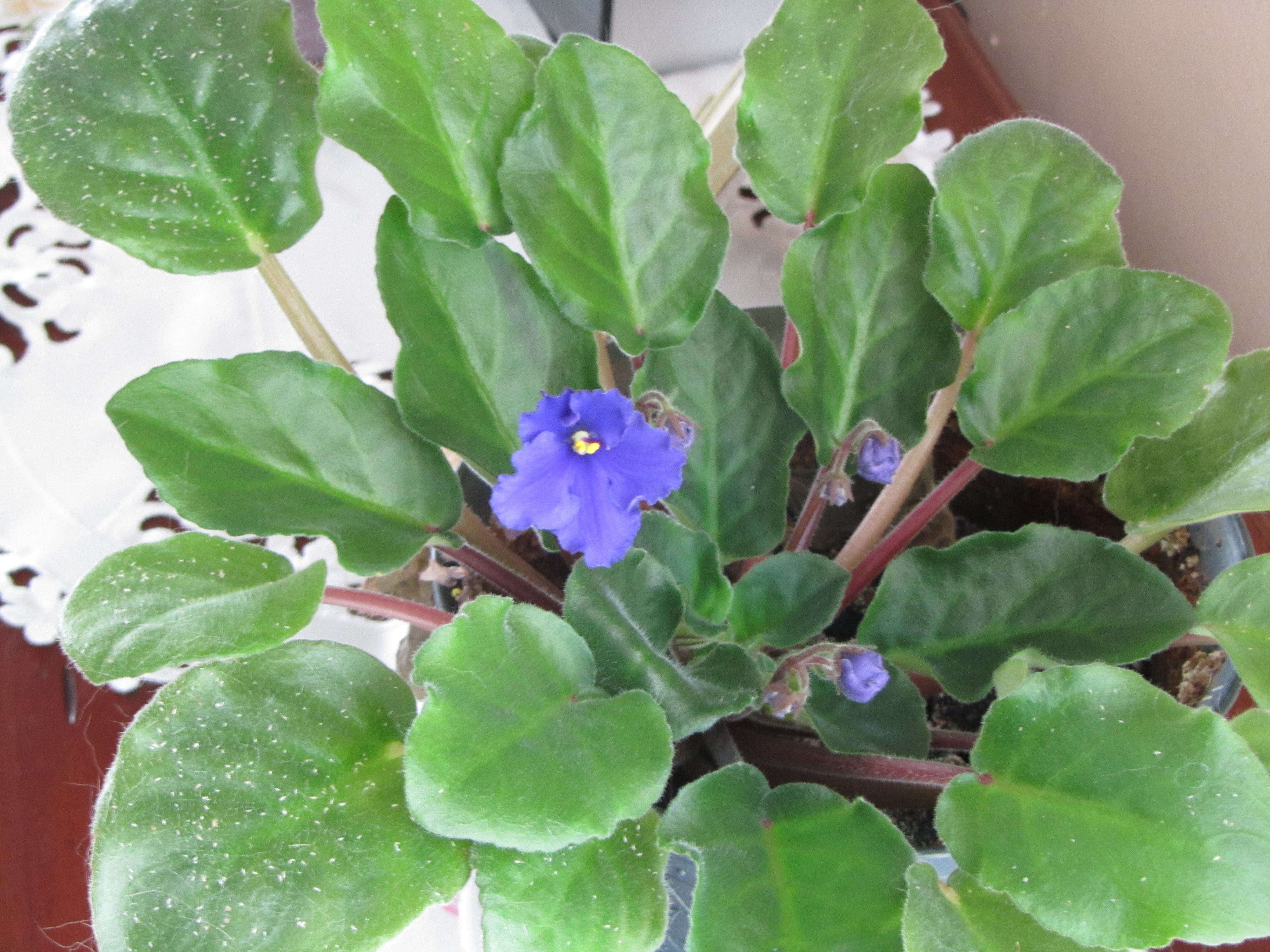 IMG_2330 Fifteen years ago my mom gave me a beautiful African Violet. The first time it bloomed its leaves were barely visible beneath the purple blossoms. That Christmas, my grandsons were playing tag and knocked the violet onto the floor. I picked it up, put all its dirt I could salvage back into the pot and added new. But the plant never bloomed again. That is, until one year ago. Right after she died. Again blossoms hid the leaves.  In an unidentifiable way, its blooming again comforted me. Many possibilities or explanations came and went through my thoughts, none strong enough to stay. Then, a few days ago, one year after her death, I noticed two new blossoms and an explosion of buds. I still have no explanation, nor do I want one. But with the violet’s renewed zest for life, it causes me to pause, stand apart from my daily busyness and bask in my favorite “Mom” memories.